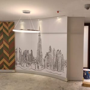 Once approved, the designs were produced as custom wallcoverings and installed across multiple meeting rooms at the Mercure Hotel Dubai. The final execution enhanced the environment with subtle, professional visual storytelling suited to corporate settings.